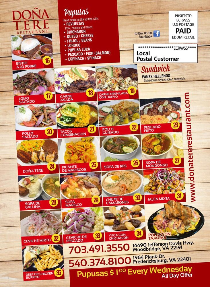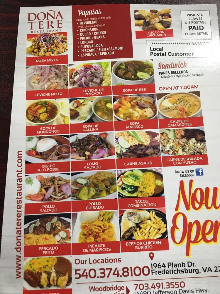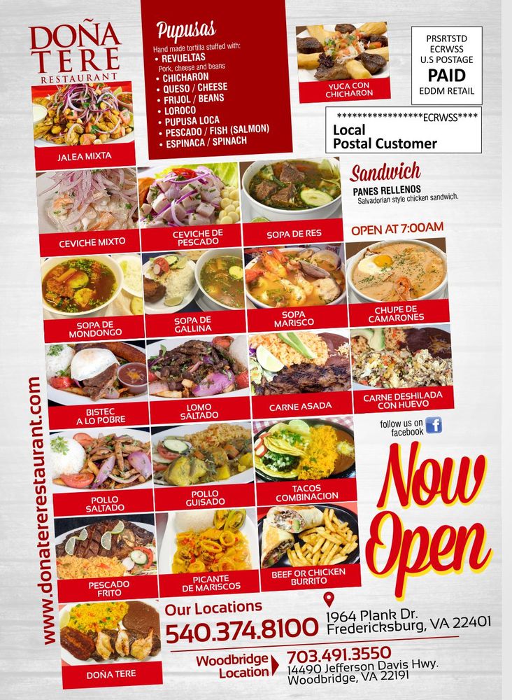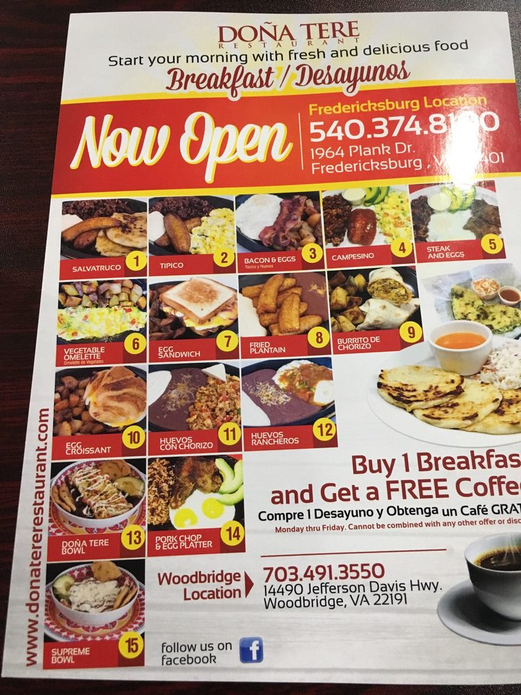 Introducing the menu at Dona Tere Restaurant in Fredericksburg, VA, where Salvadoran and Peruvian flavors blend seamlessly for a delightful breakfast and brunch experience. From the signature Salvatruco Pupusas to the flavorful Sopa Mariscos, the menu offers a variety of dishes that cater to different tastes. Standout options include the Catracho Baleada, the Lomo Saltado, and the Dona Tere Steak with jumbo shrimp. The friendly staff and inviting atmosphere add to the overall dining experience, making it a must-visit spot for those craving authentic and delicious Latin American cuisine. Dona Tere Restaurant also takes pride in its freshly baked treats, including the outstanding pupusas and the delectable tres leche dessert. Whether you're a food enthusiast or simply looking for a memorable meal, Dona Tere Restaurant is a hidden gem waiting to be discovered.